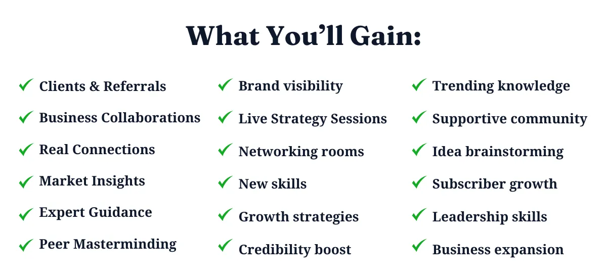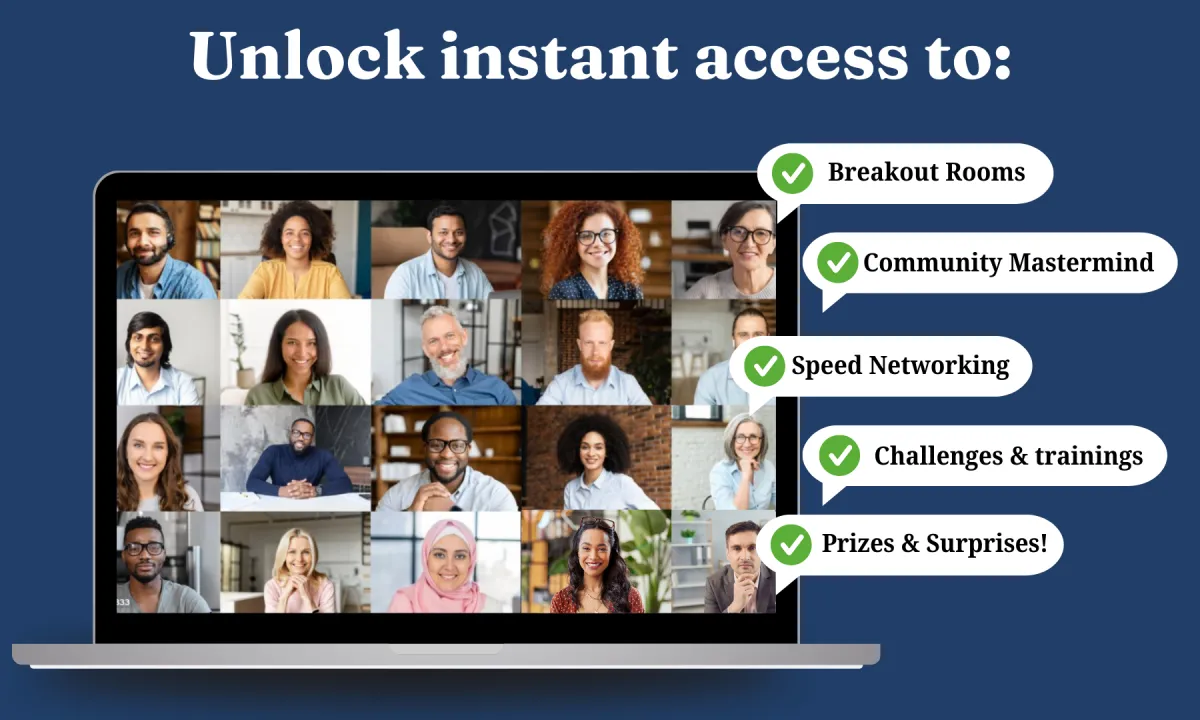 A: Membership gives you access to weekly group accountability sessions, focused breakout rooms, mastermind and roundtable discussions, speed networking, a searchable business referral directory, and on-demand session replays. You also receive exclusive resources, bonus content, and VIP perks that drive growth.